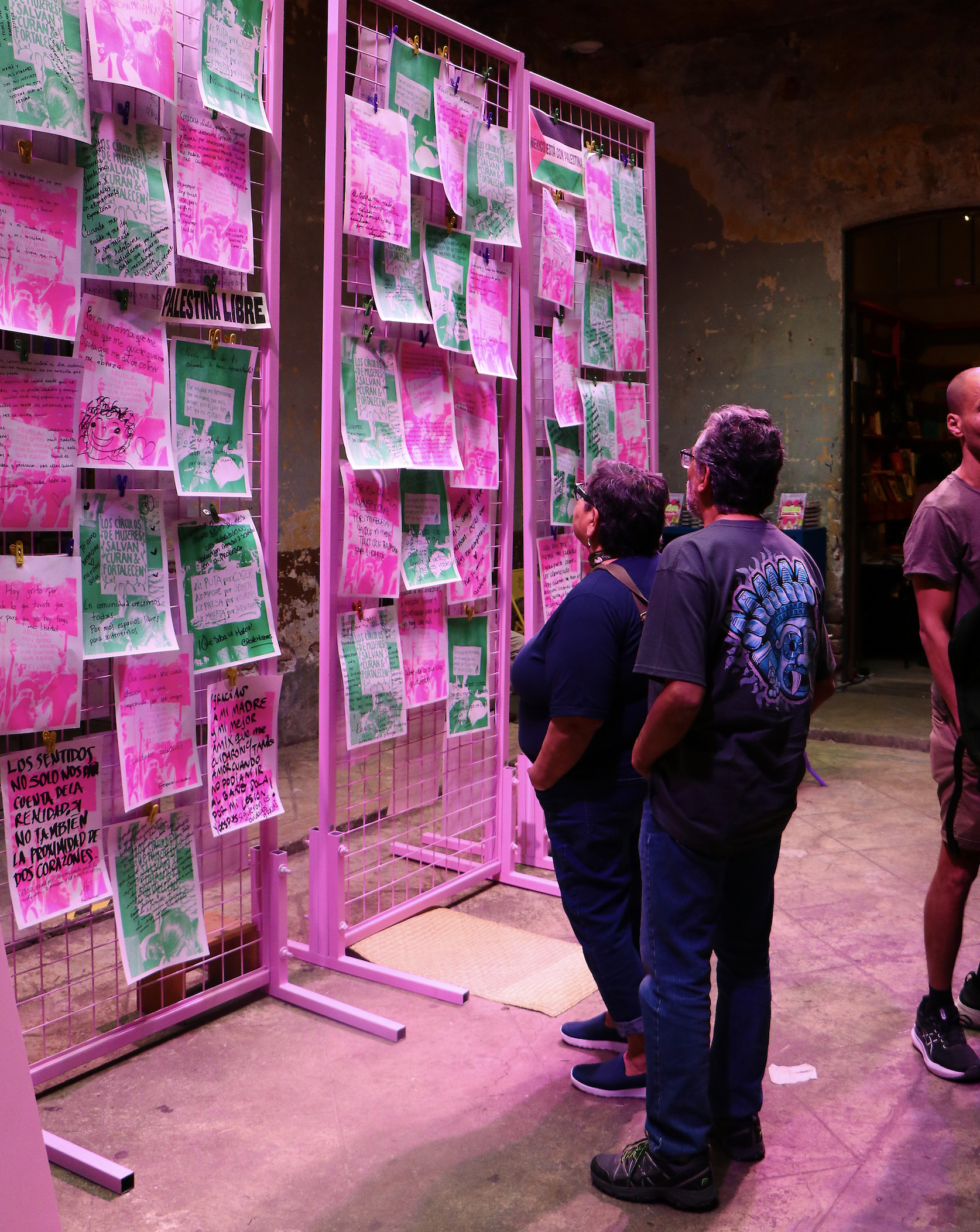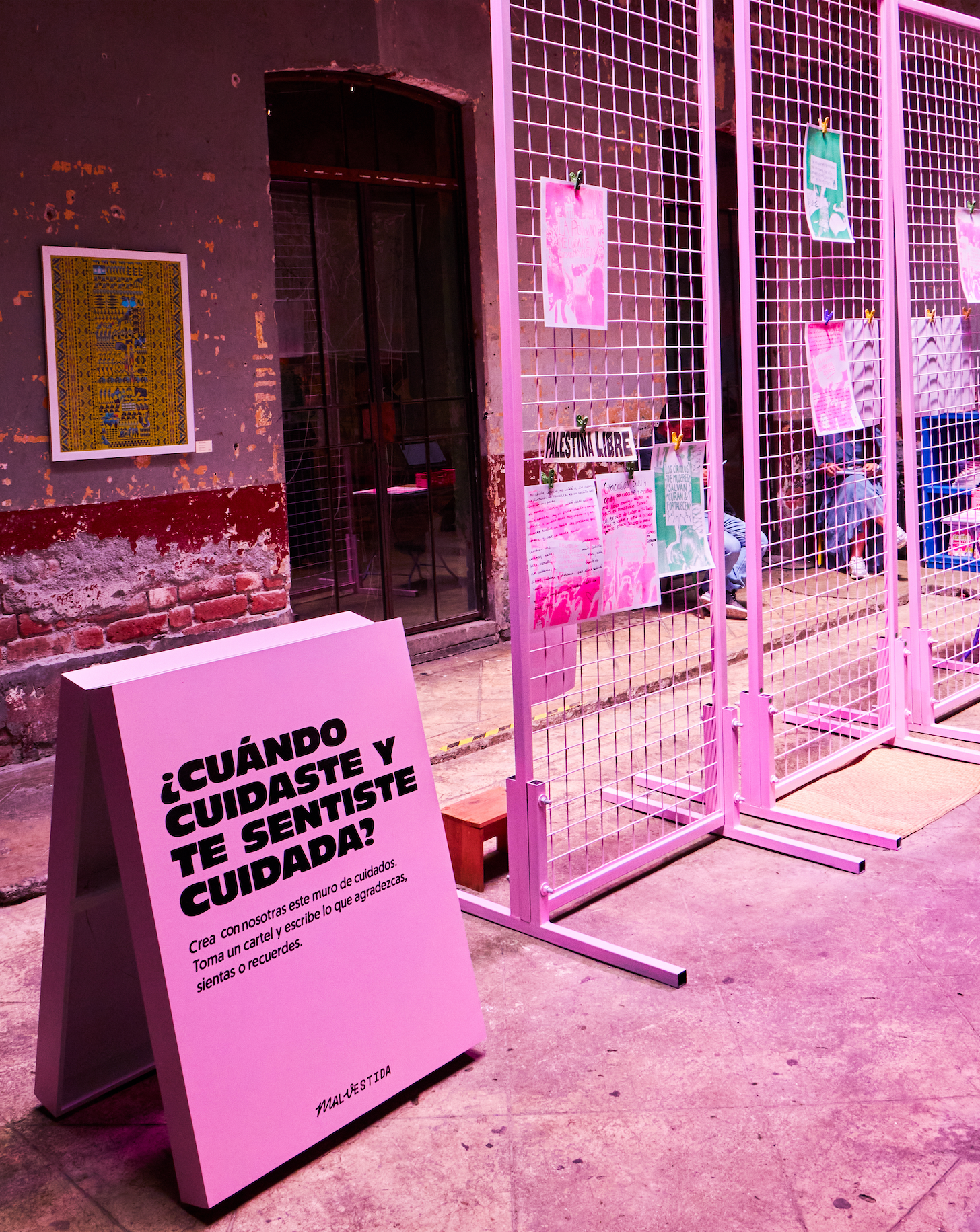 Tras seis años documentando la lucha de las mujeres en Ciudad de México para el medio de Comunicación Malvestida, realicé una instalación con fotografías impresas en risografía que integraban mensajes de cuidado entre mujeres. El público intervenía el muro respondiendo: ¿cuándo cuidaste y cuándo te sentiste cuidada? La pieza buscó visibilizar los trabajos de cuidado como una red afectiva y colectiva entre mujeres.